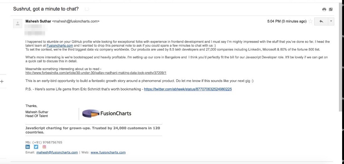 My call to action has always been a brief 15 minutes call. If you’ve written a good cold email, your target candidate should be willing to make an investment of 15 mins. A short call also forces the candidate to think about what we are going to talk about in the call. This makes the candidate invest in looking at the company and thinking about the role. The idea gets incepted and they can see themselves in the role I am selling.