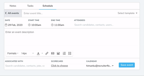 We launched two-way calendar sync in the latest release. This means, that no matter what you are using to schedule calls and interviews, all the calendar events will get synced with Recruiterflow automatically. Just like we always did with emails! This feature is rolling out gradually to all the accounts. If you’d like to opt-out of this, let us know on the support live chat.