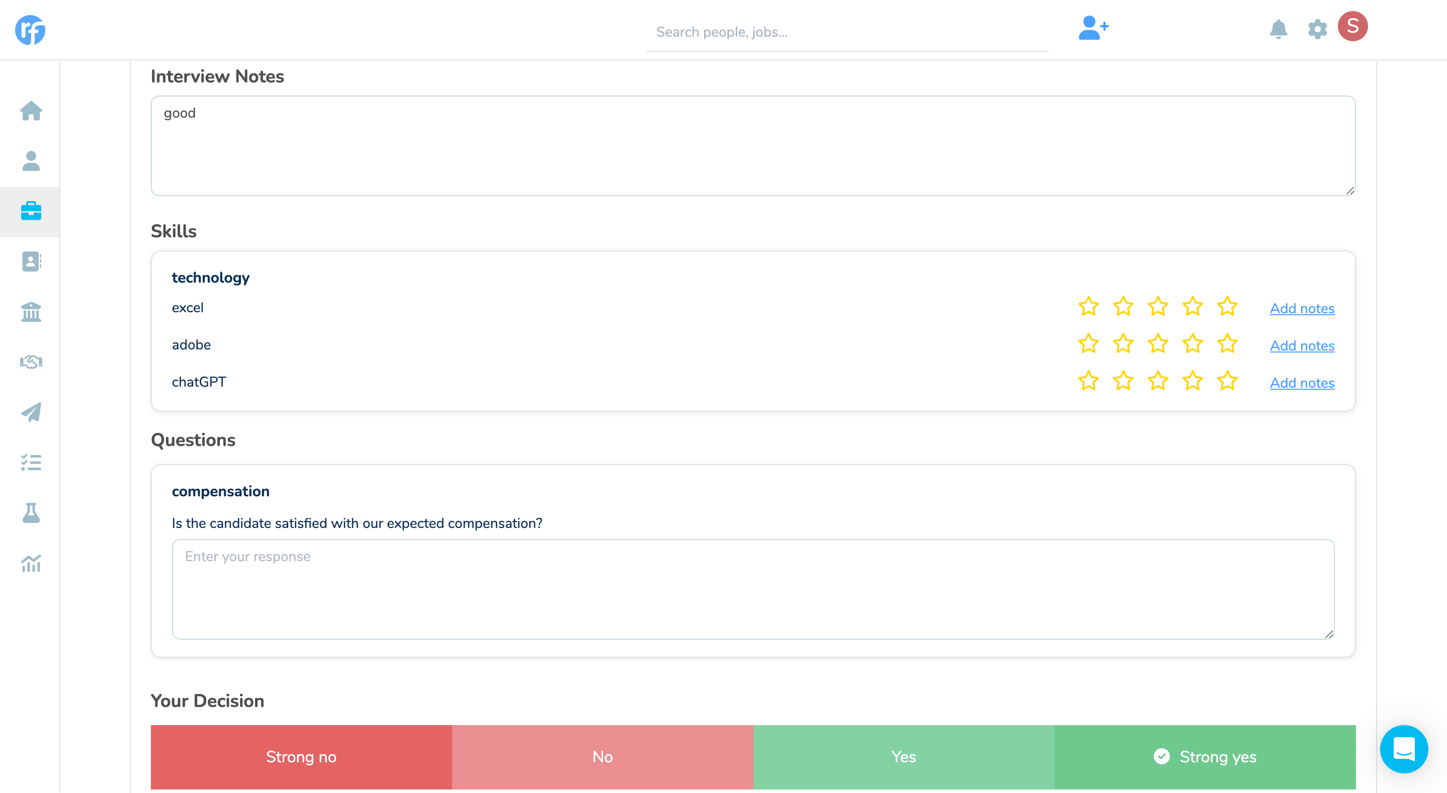 Also, use a scoring system to rate candidates on each question. This makes it way easier to compare them. You can use Recruiterflow’s interview scorecards for this. Along with scoring, it also allows you to include feedback from everyone involved.