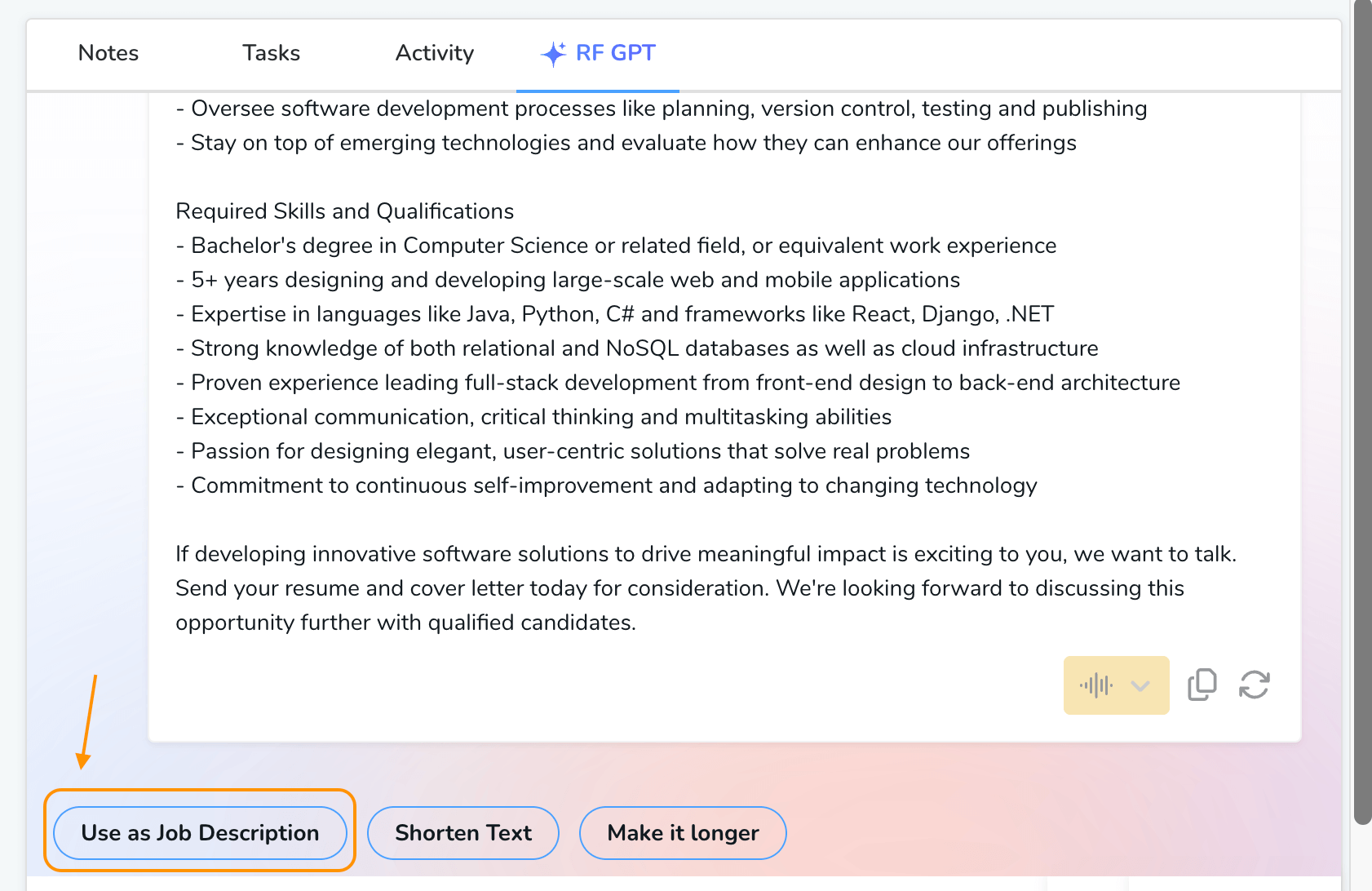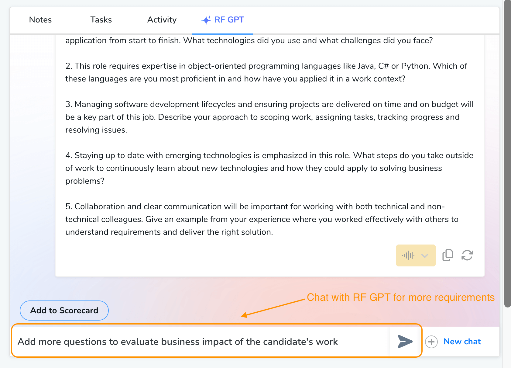 Create a question bank that aligns with the job requirements. Take help from RF GPT for creating custom screening questions relevant to a specific role.