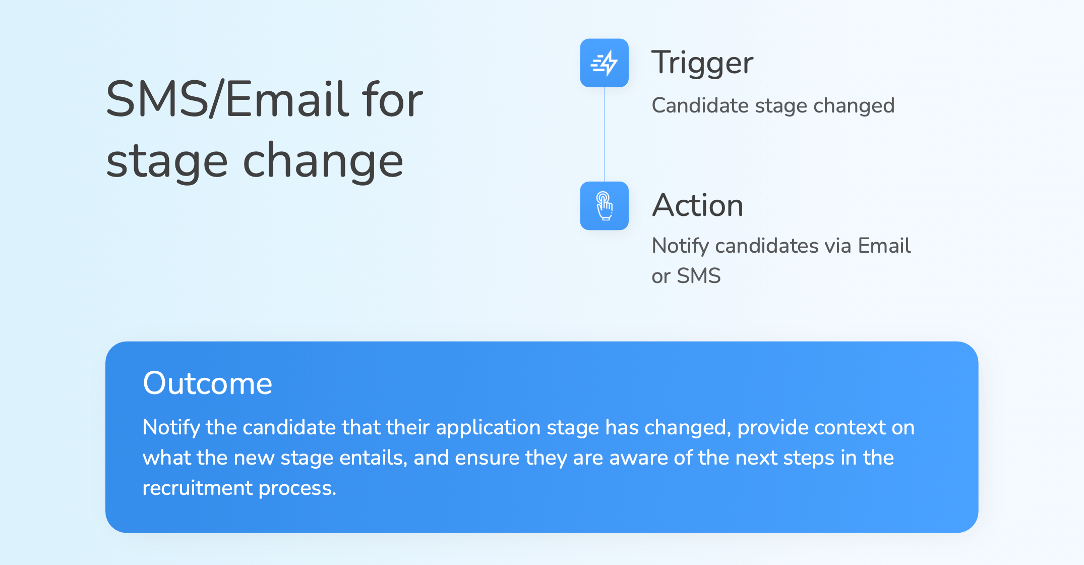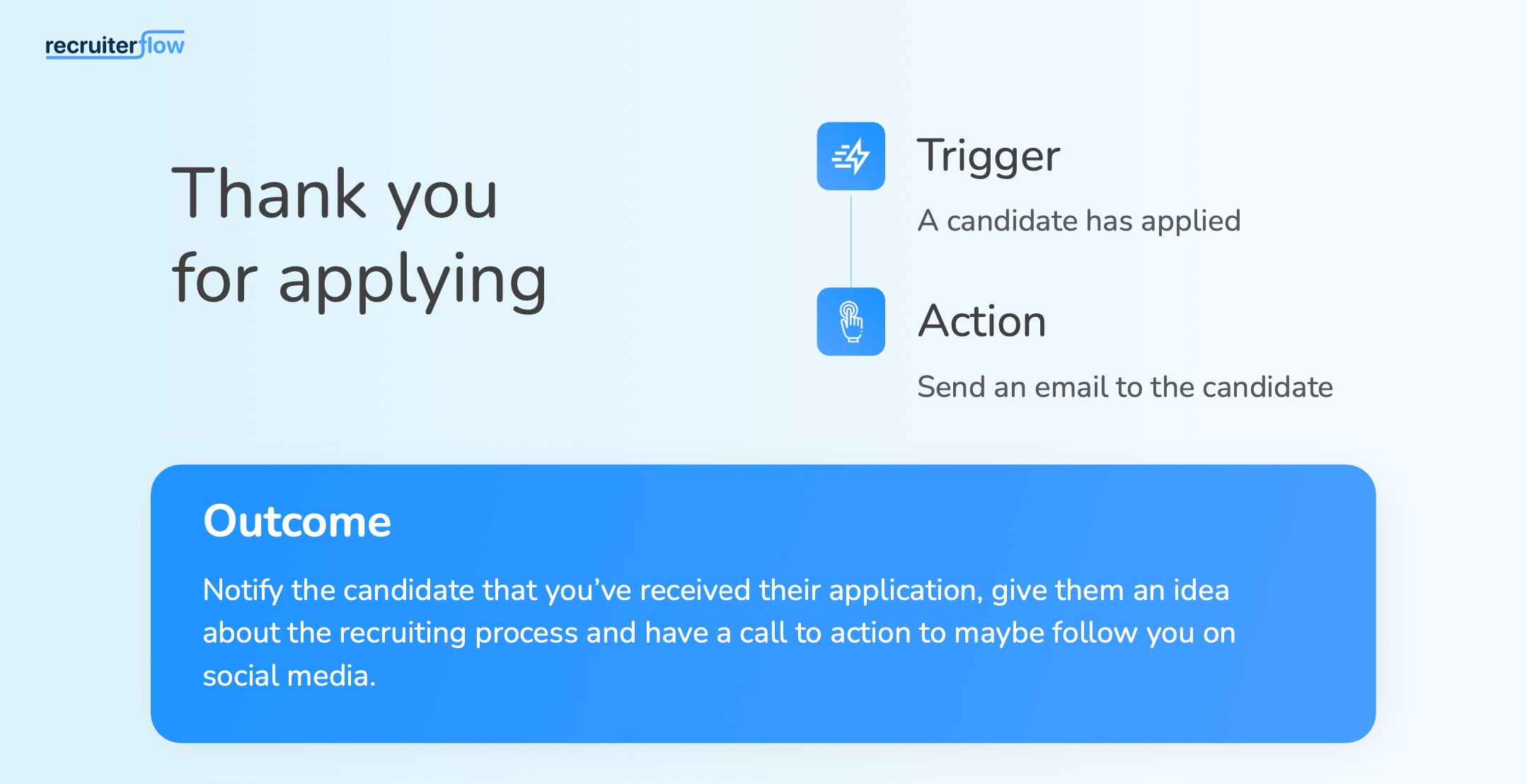 For example, you can use Recruiterflow to send an automated email right after they apply through you, outlining the next steps and how long things usually take. You can also set up automated reminders for follow-ups and updates so no one feels forgotten.